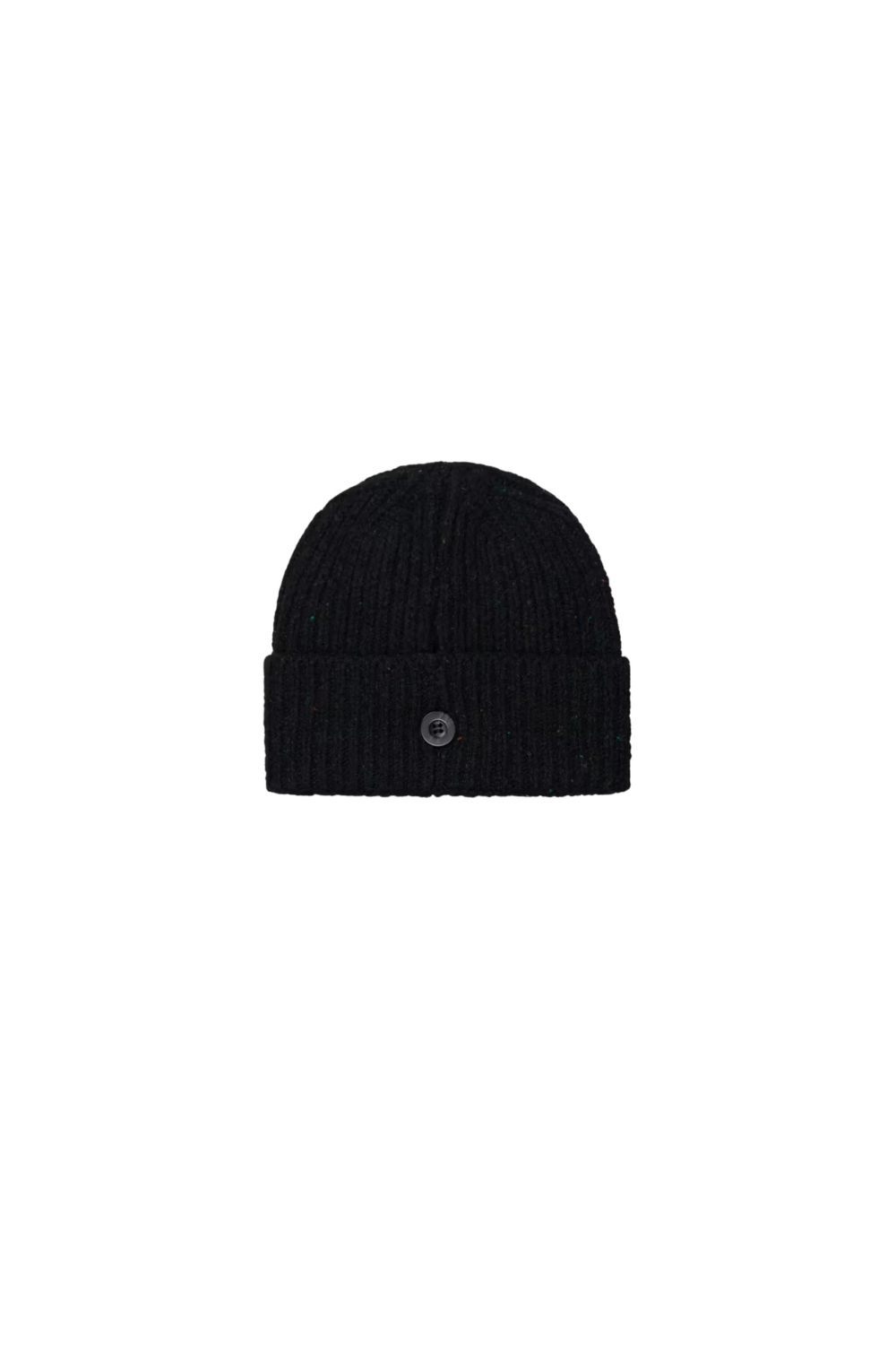 The Anglistic Beanie is knit from a tactile blend of lambswool, cotton, and Acrylic yarn in a stretchy rib stitch, and features a subtly speckled look throughout. Its cuff is detailed with a woven Square Label on the front, and a fixed faux-horn button at the back.