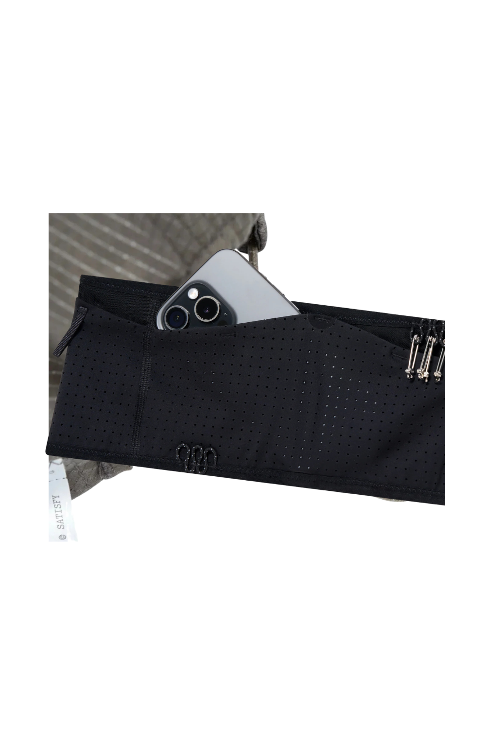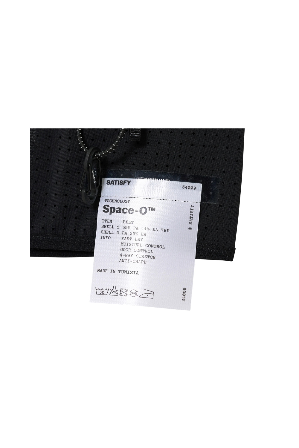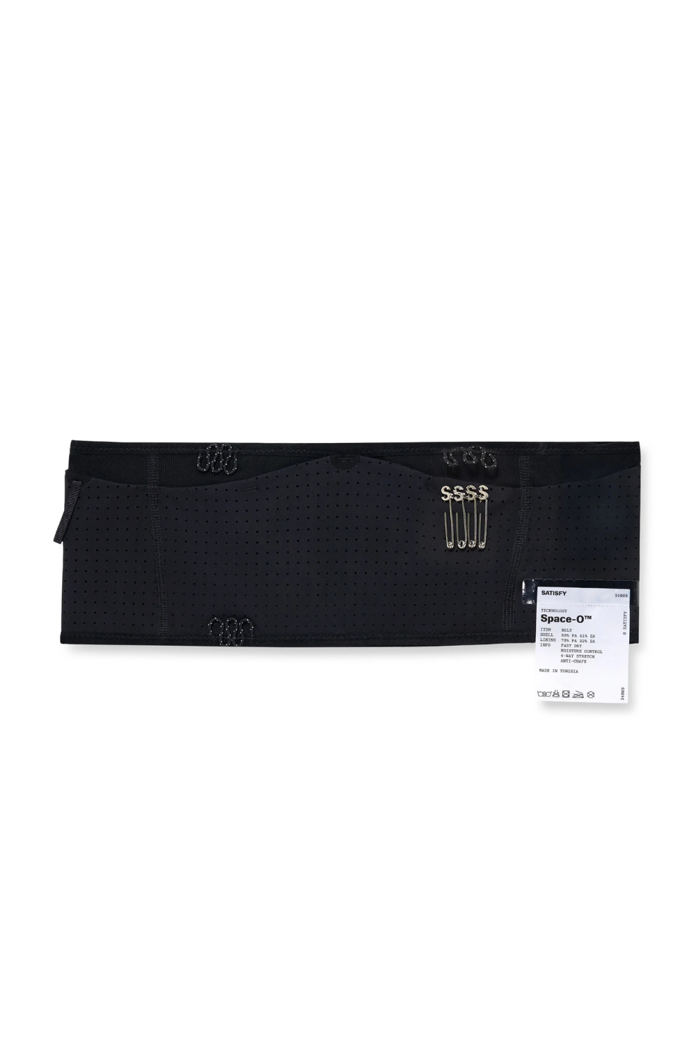 Necessity meets stability. 45 grams of Space-O™ Belt. A precision cargo solution, wrapped close. Built to hold nothing back. Space-O™ Italian micro jersey with precision punched openings. Four-way stretch that responds to motion. Engineered for long, high-level effort. 4-pocket cargo system for phone, gels, keys. Sweatproof barriers keep electronics dry when effort peaks. Bib attachment system with two adjustable options: front or side. 4 SATISFY S-Pins included for front or side bib fastening.