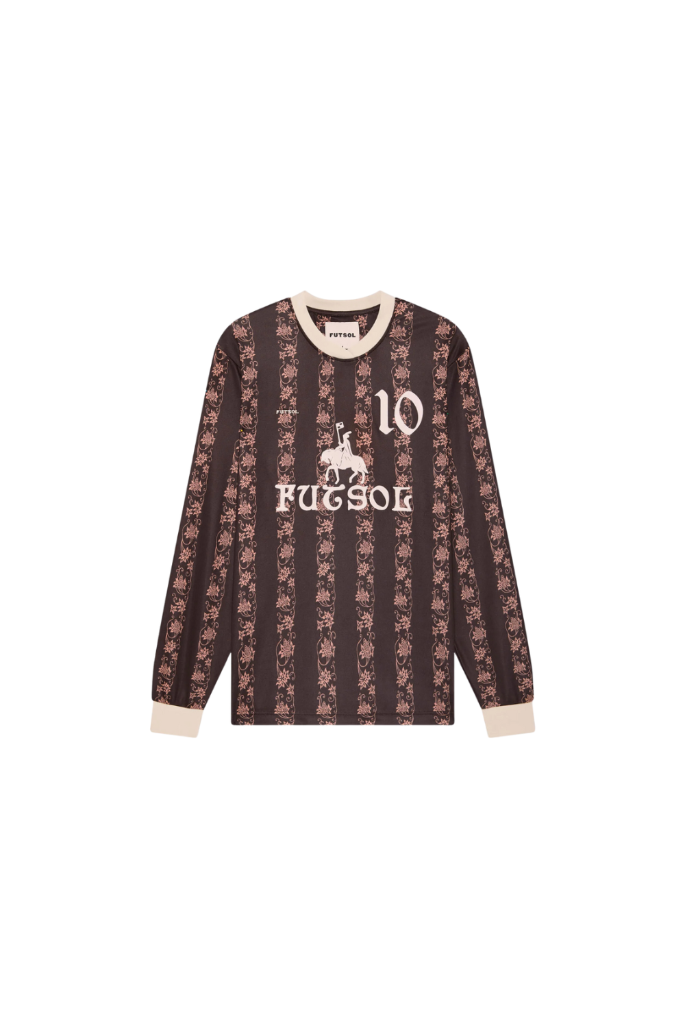 The ornate stripe motif, taken from the spines and borders of ancient bucolic British book covers, is a repeat symbol of this collection, and adorns this crewneck with football stripes more intricate than your average Dog And Duck team. A large centre crest is crafted from an ancient folkloric horse (proudly carrying a corner flag, of course). It all nods to the feel of this season – a celebration of the great outdoors, a tribute to the ancient, mythical traditions that shaped the beautiful game.