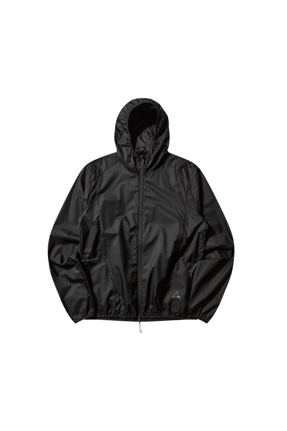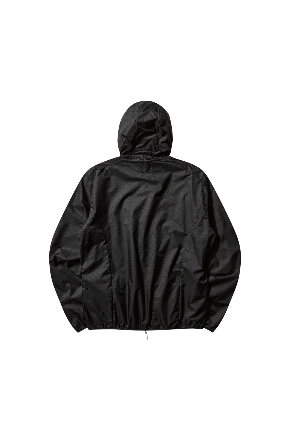 Lightweight hooded windbreaker in black colour. Extremely lightweight transparent micro ripstop nylon with lazered details. Close fit. Packable for easy use and storage. Centerline zipper opening and two front pockets.